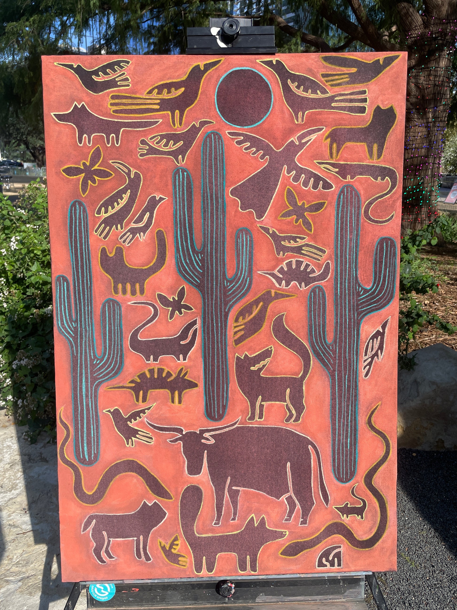 Animals featured in this painting, are coyotes, green anole lizards vultures longhorns, armadilloās and butterflies