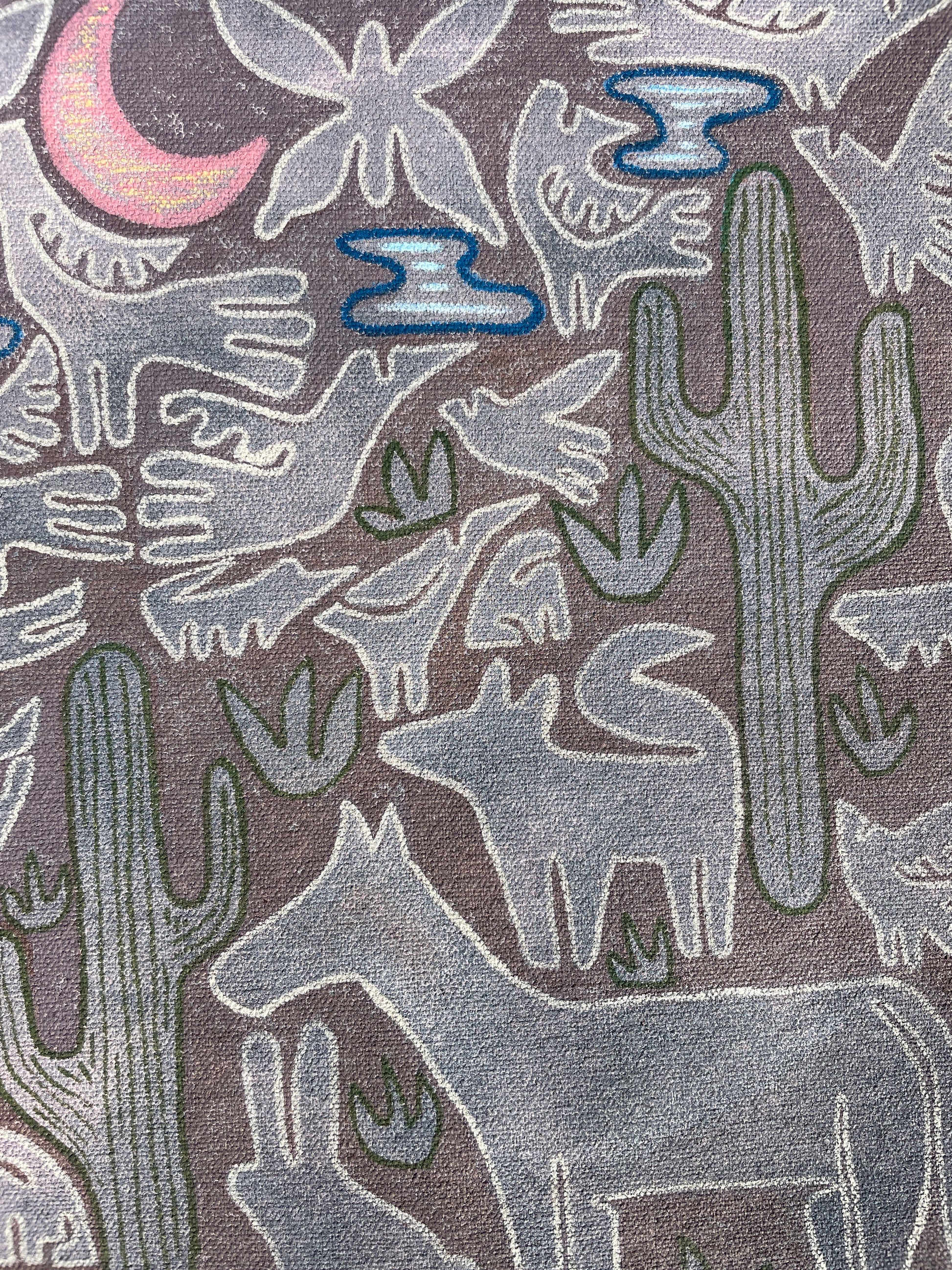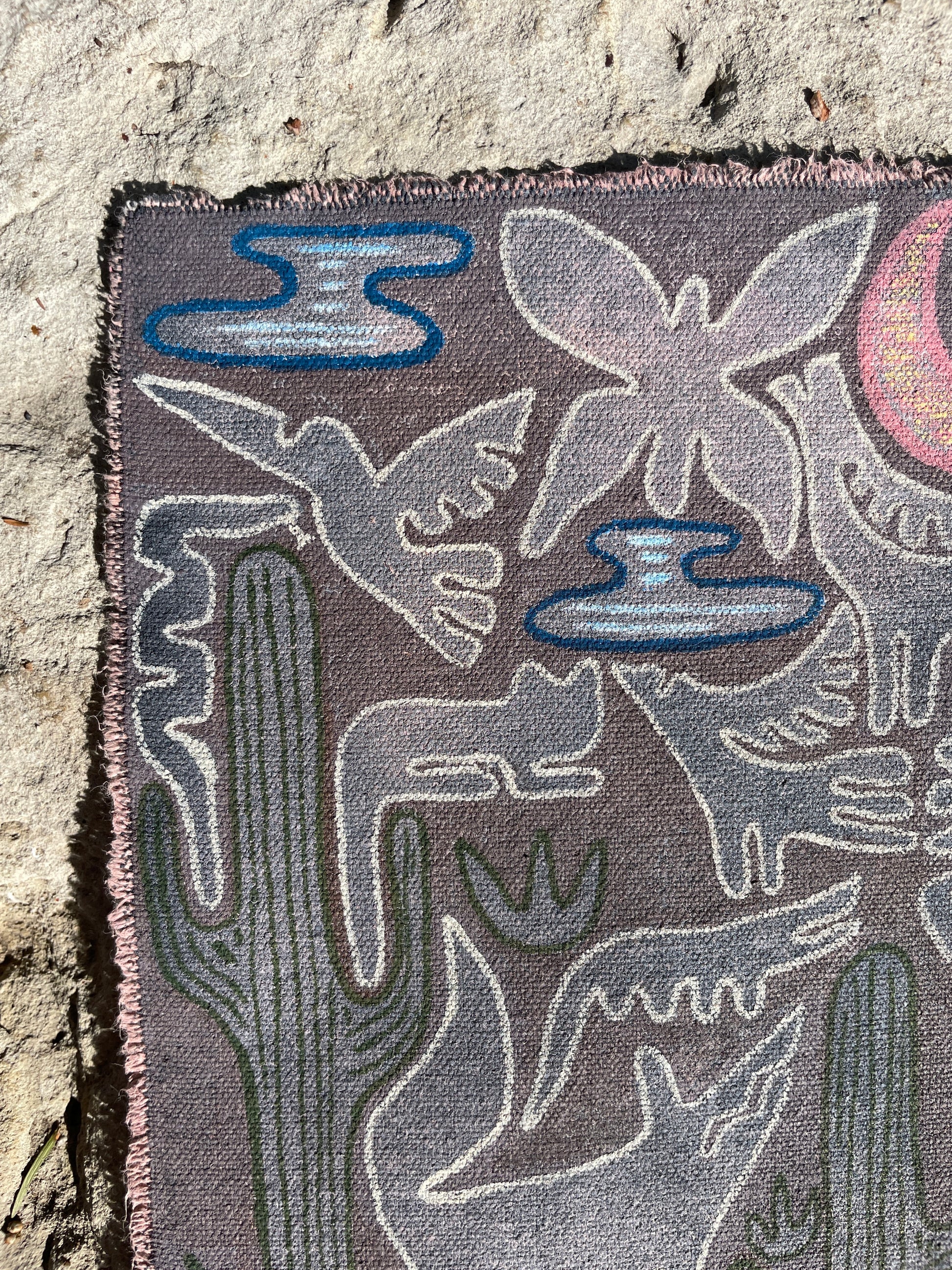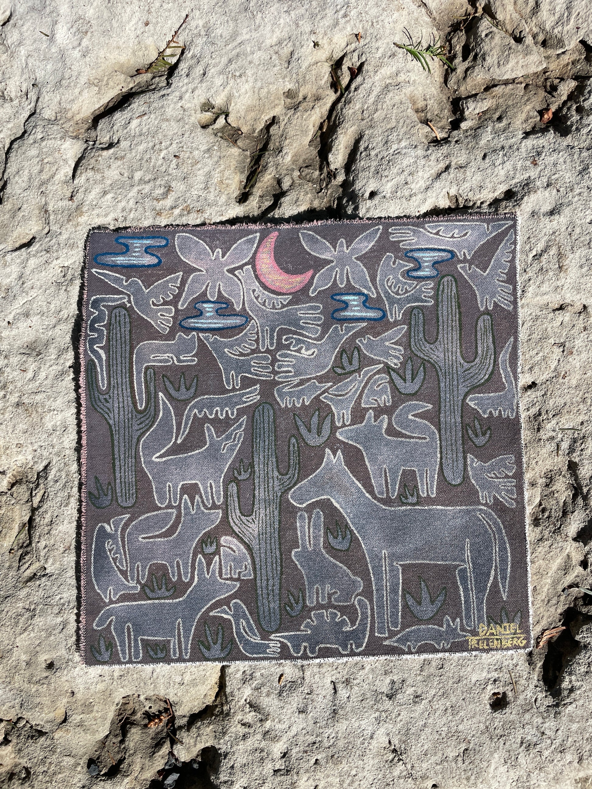 Head into the Wild West with WilDanimal # 28 painting of prickly pear cactuses , birds, butterflies, coyotes, desert animals, and Southwest animals