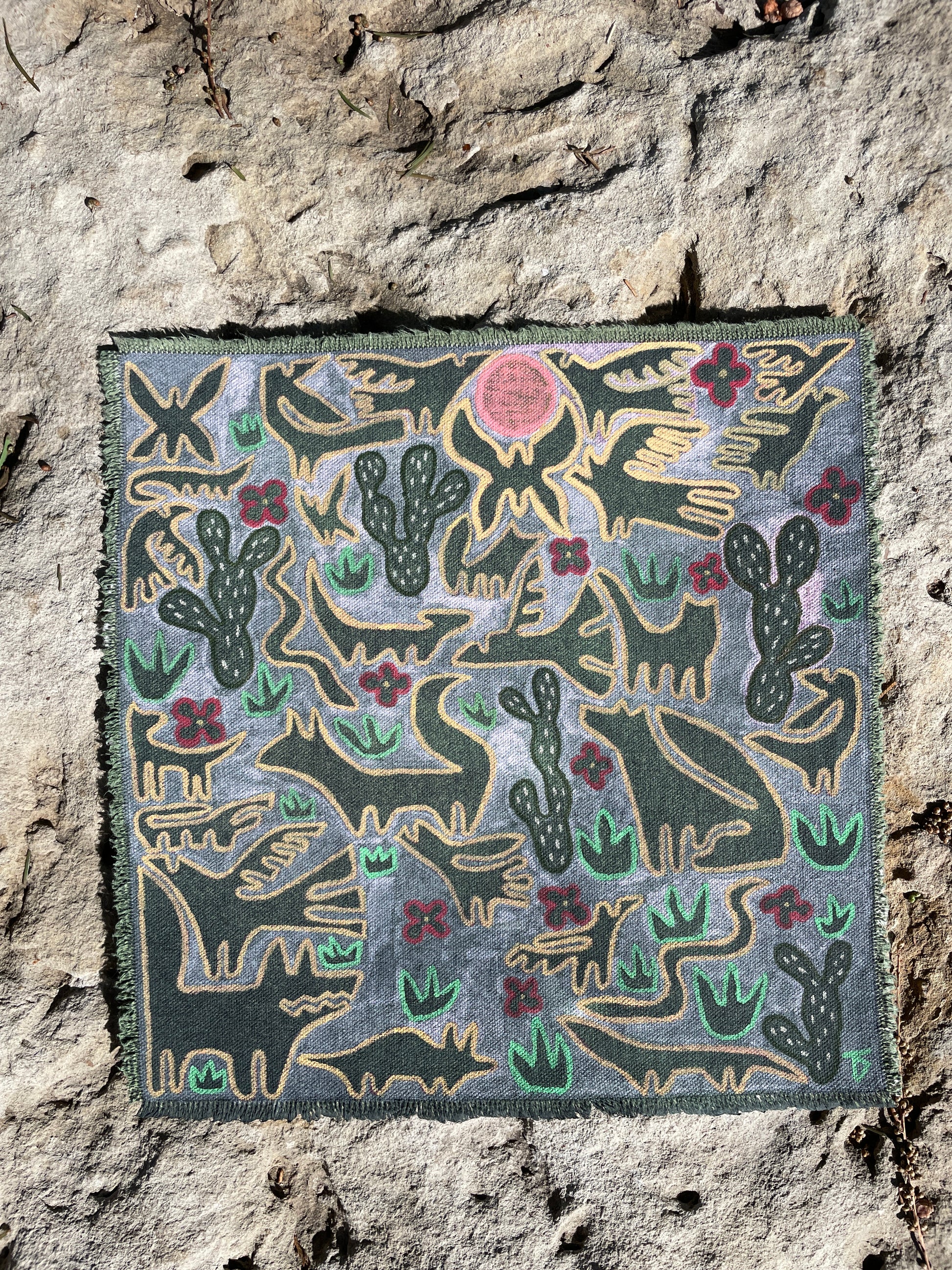 Head into the Wild West with WilDanimal #29 painting of prickly pear cactuses , birds, butterflies, coyotes, desert animals, and Southwest animals
