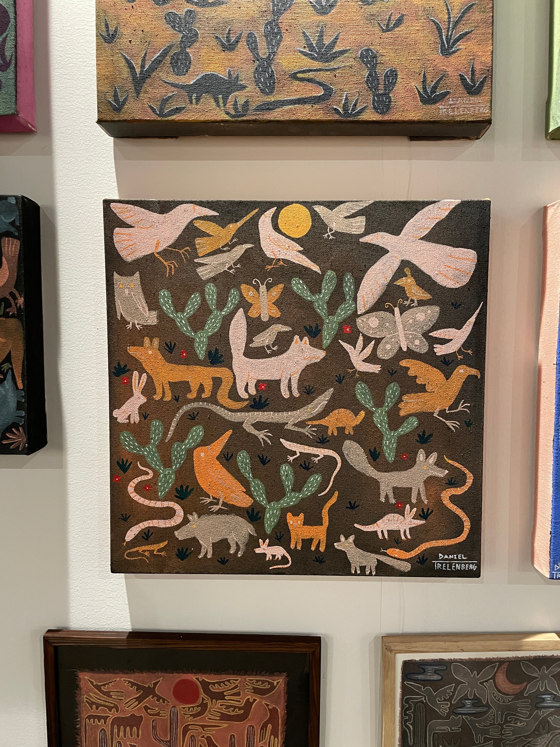 Head into the Wild West with WilDanimal #35 painting of prickly pear cactuses , birds, butterflies, coyotes, desert animals, and Southwest animals